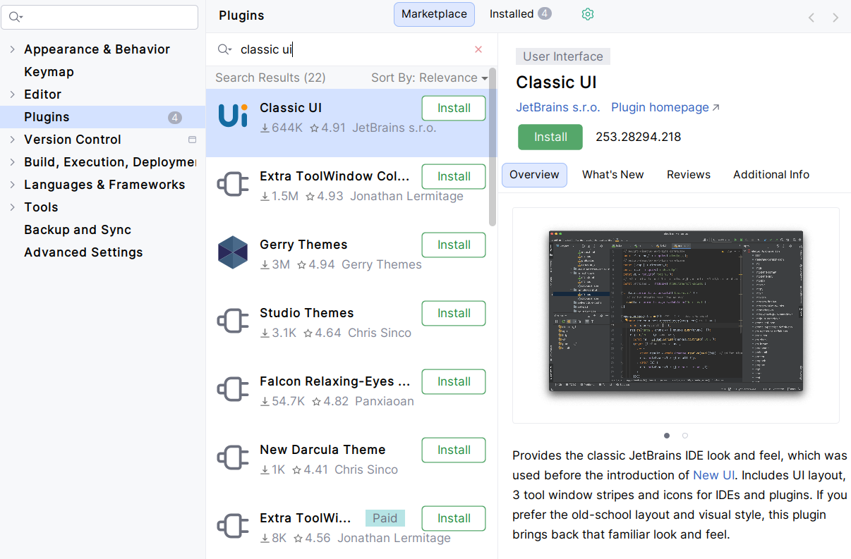 If, like me, you don’t like the new IntelliJ UI, you may want to install the Classic UI plugin. This is an official plugin from JetBrains which restores the good old UI, now called the “Classic UI”.