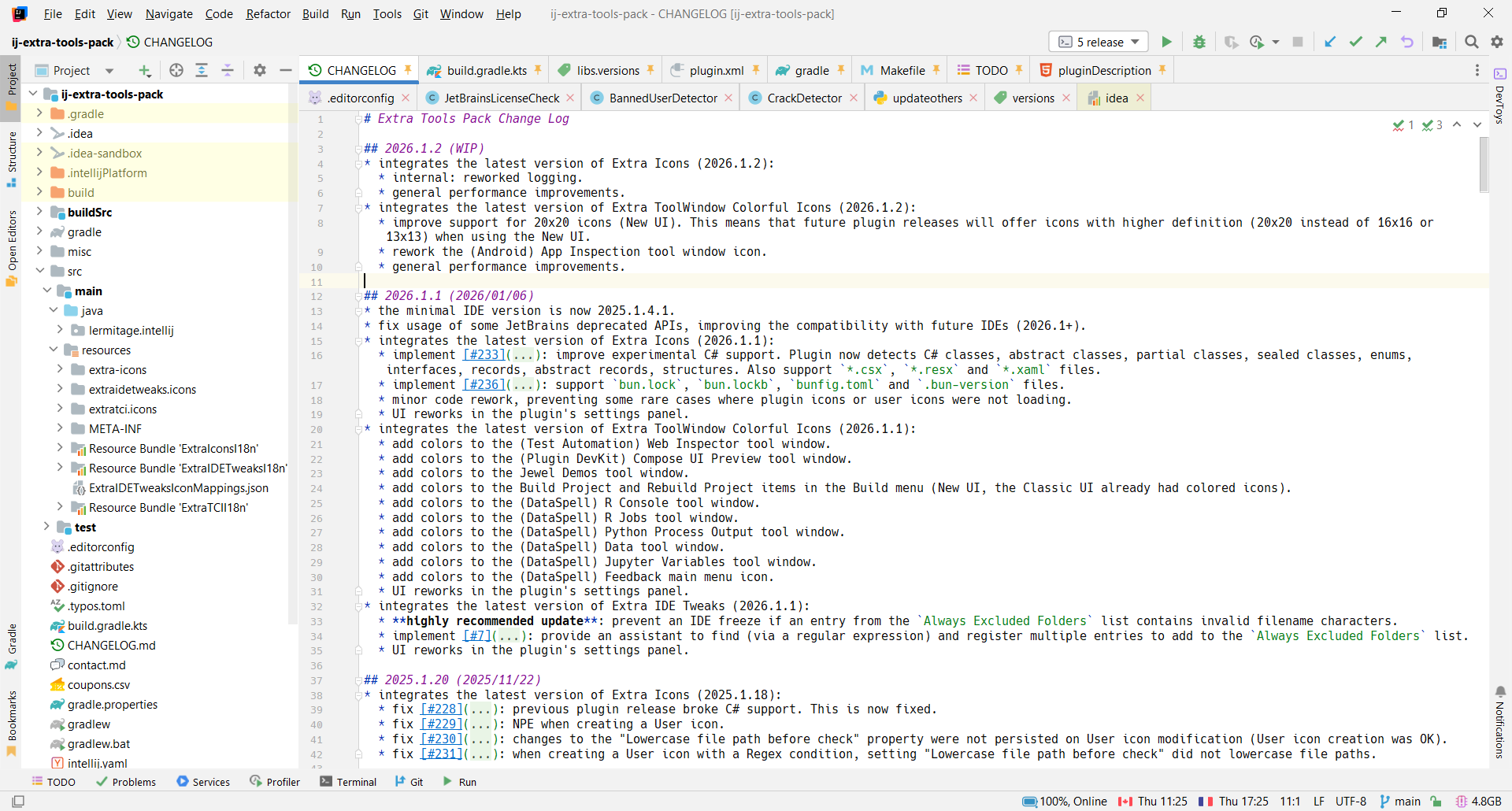This is how my IDE (IntelliJ Ultimate 2025.3.1.1) looks like, with the Classic UI plugin, plus some of my plugins like Extra Icons (better file and folder icons), Extra ToolWindow Colorful Icons (colored icons in menus and in tool windows, otherwise they would be in grayscale):