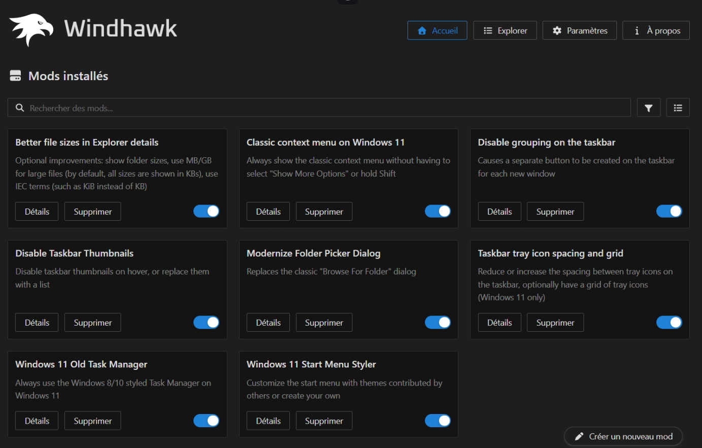 Users of Windows 10 (and 8 or 7) may know 7+ Taskbar Tweaker. I use it to disable icon grouping in the taskbar. Unfortunately, it doesn’t work on Windows 11. Instead, its author created a new and powerful software called Windhawk. It’s free, and it supports most of the 7+ Taskbar Tweaker features, plus extras. It can modify the taskbar, the Start Menu, the File Explorer, the Task Manager, etc.