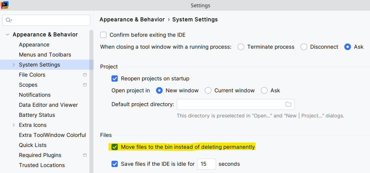 IntelliJ 2026.1 EAP now has an option to move files to the trash / recycle bin on deletion.